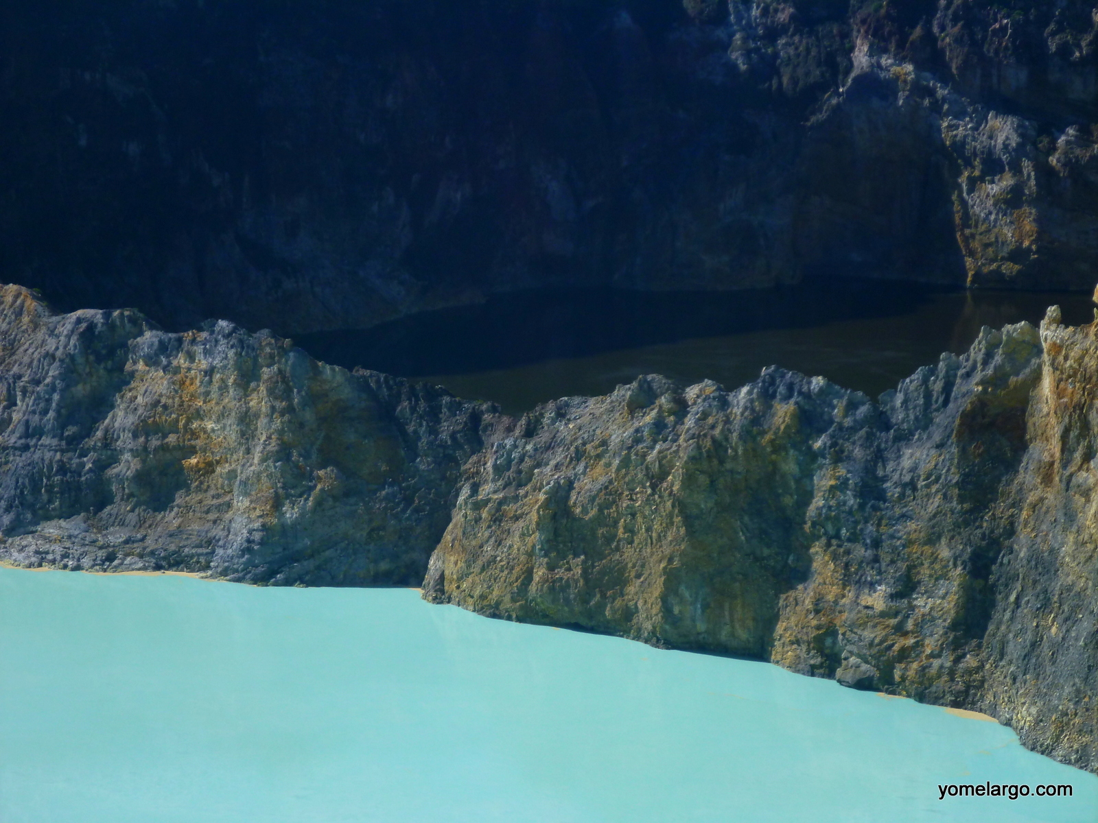Lo curioso del volcán Kelimutu es que tiene 3 calderas o cráteres individuales, cada uno con una emisión distinta y una coloración de agua diferente. De hecho, los colores no son constantes y van cambiando con el tiempo. Ví fotos de las calderas hace un año y eran diferentes; los colores que tenían las dos principales cuando yo llegué, separadas por pocos metros de roca volcánica, eran un marrón fuerte barroso y un azul sintético claro que volvía el paisaje bastante surrealista o marciano.