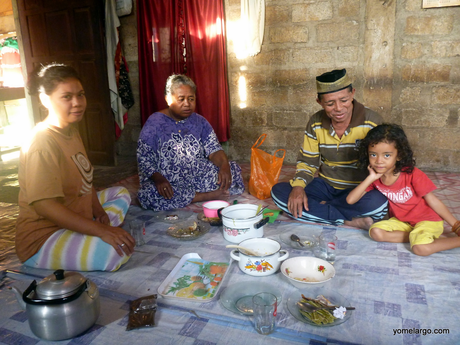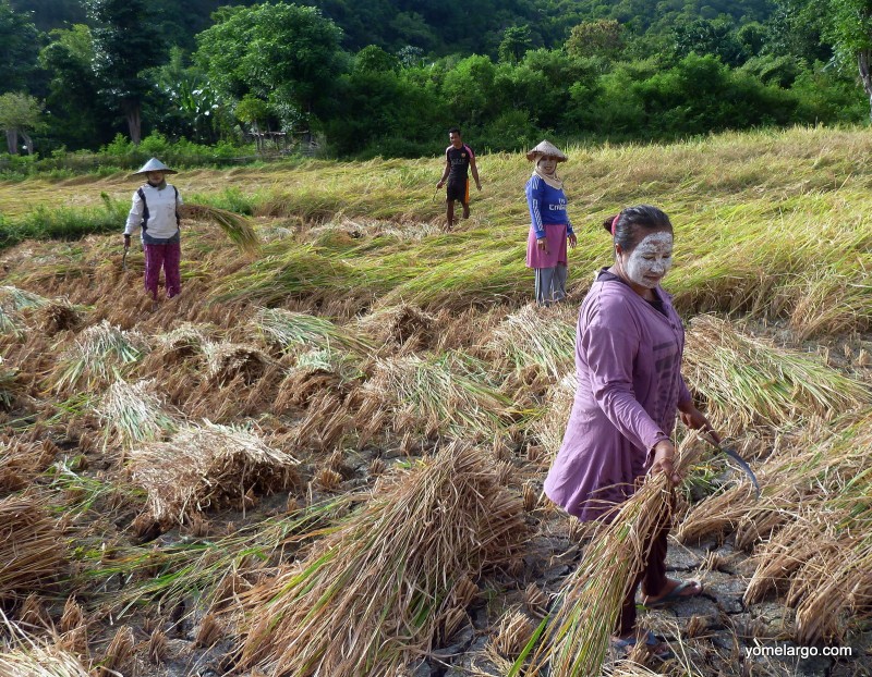 Ya en un clima más normal, en una aldea diminuta y familiar que divisé lejana desde la ruta, con una mezquita musulmana en medio, pasé otra de las noches. La encontré preguntando a unos mozos que trabajaban el arroz, pues estaba perdida de veras. Al llegar era tarde y no había opción de continuar, así que tuve que ingeniármelas para quedarme en algún lugar aunque no me invitaran… Esta vez me volvieron a mandar a la que habla inglés del pueblo, y ahí ya acostumbrado al tema y a las precarias condiciones en que viven los rurales, todo fue rodado. Creo recordar que no me dejaron pagarles nada ni por las comidas. Hasta parecía, al comer, sin tener explicación, que estuviesen completamente cómodos o acostumbrados a la presencia de un extraño.